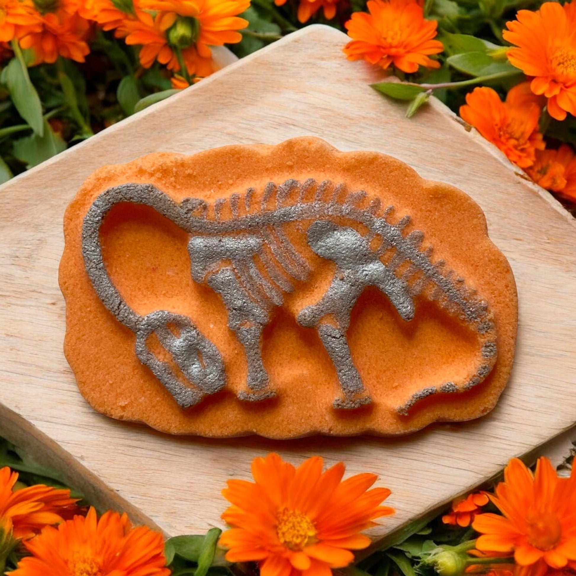 Brontosaurus skeleton bath bomb. A hidden mini dinosaur toy is within this bath bomb with color embeds. Luscious pear, boysenberry, ripe raspberry, and blackberry. 6 oz