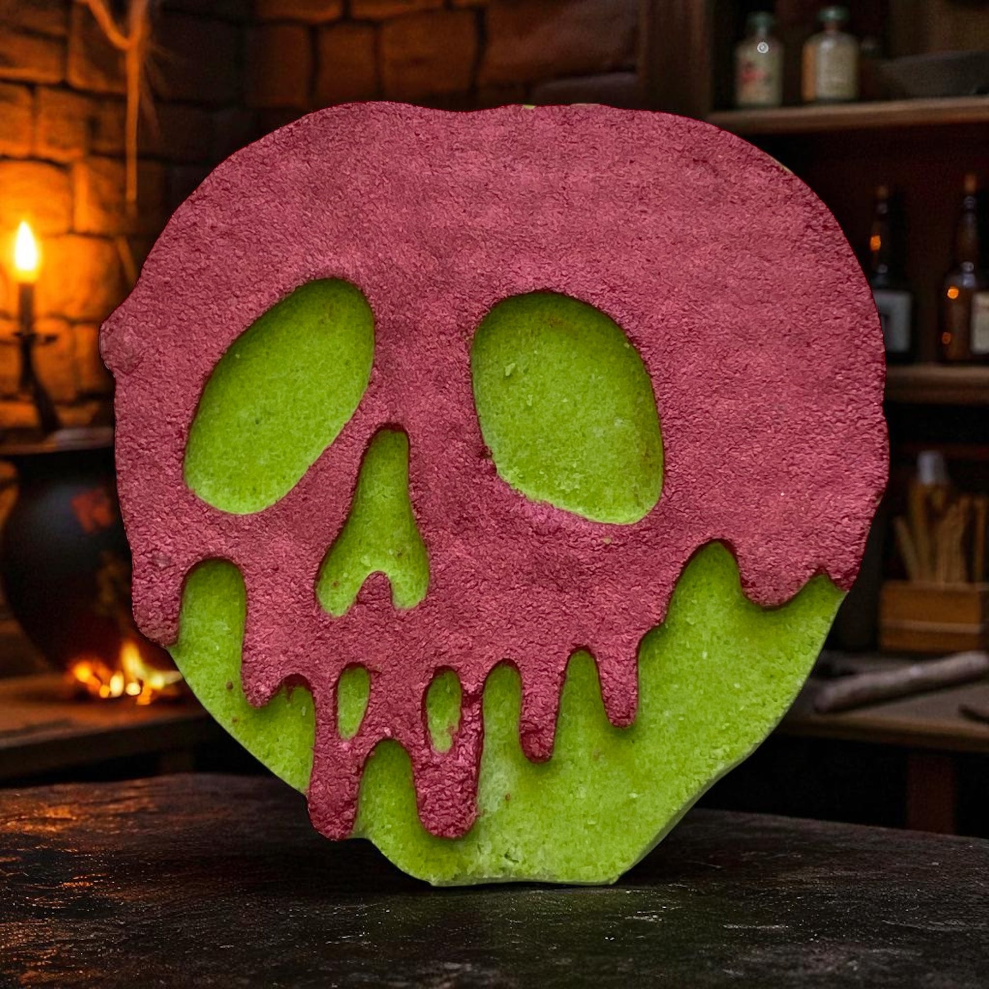 Poison apple bath bomb. Hand painted shell with hidden color embeds and a poison apple charm. Scented in banana cream pie. 6 oz