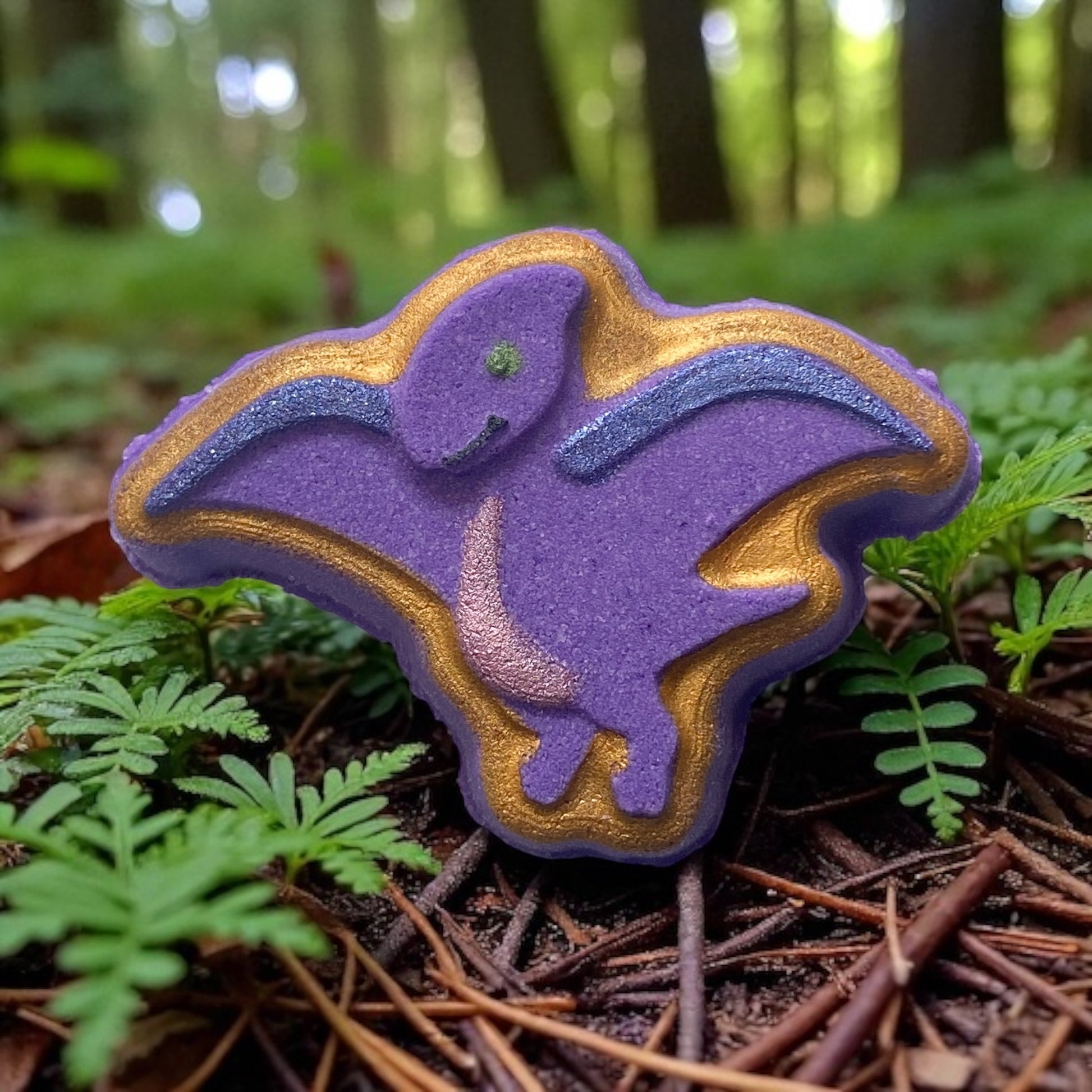 Pterodactyl buddy bath bomb. Hand painted shell with hidden color embeds and a dinosaur toy. A refreshing twist of freshly squeezed grapefruit highlighted with hints of mint leaf. 3.8 oz