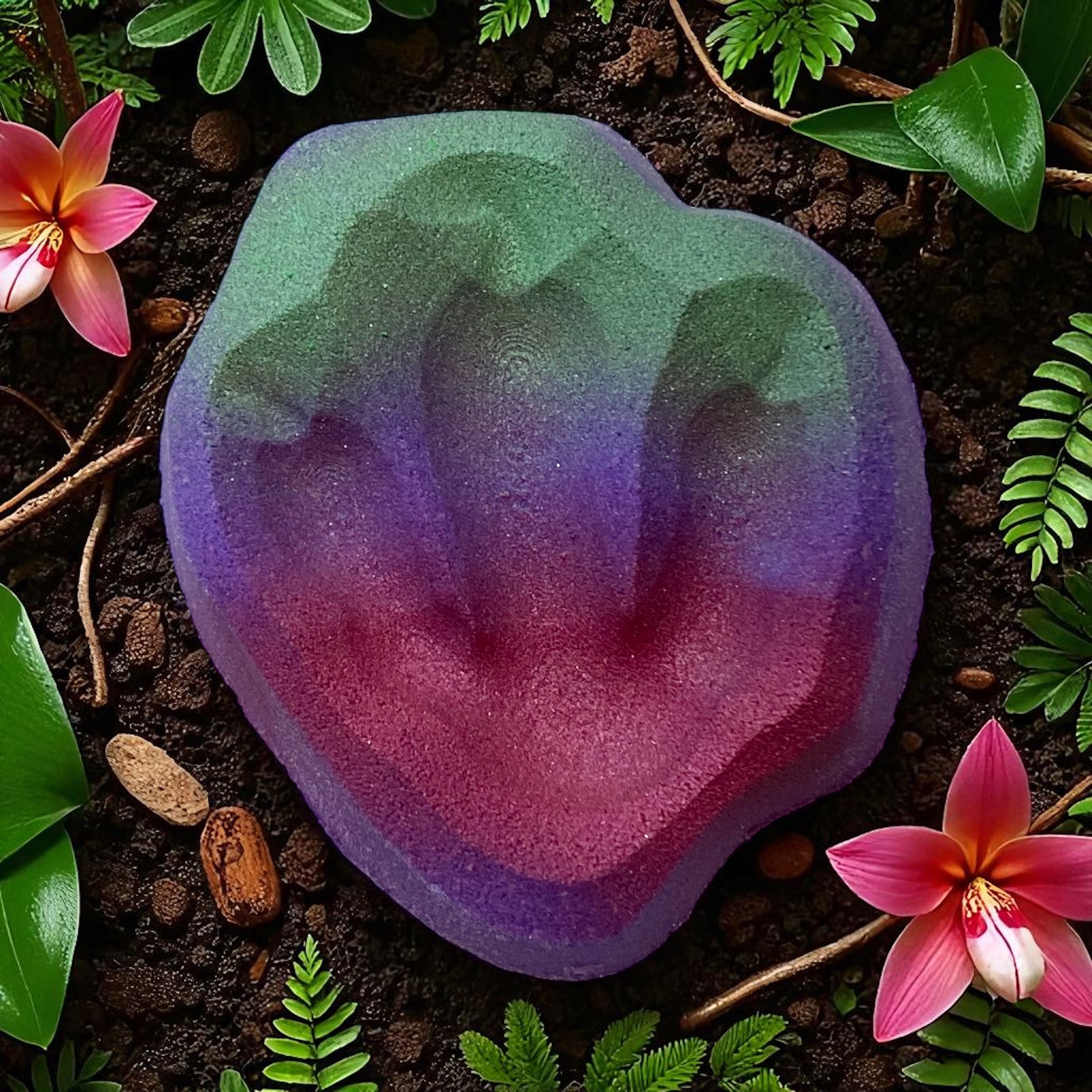 Stomp Dino bath bath bomb. Hand painted shell with hidden color embeds and a dinosaur toy. Pink Pomelo, Sweet Passion Fruit, Laelias Blooms, Yuzu Musk, Bamboo Wood, and Palm. 5.1 oz