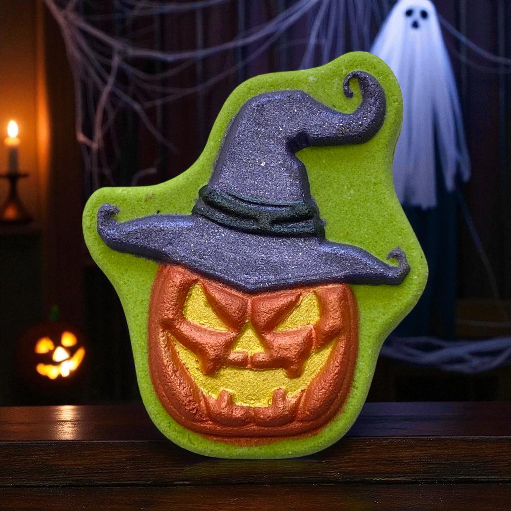 Witch pumpkin bath bomb. Hand painted bath bomb with hidden color embeds and a ghost charm. This delectably sweet scent is a combination of delicious apple, peach, melon and delicate white flower. 5.9 oz