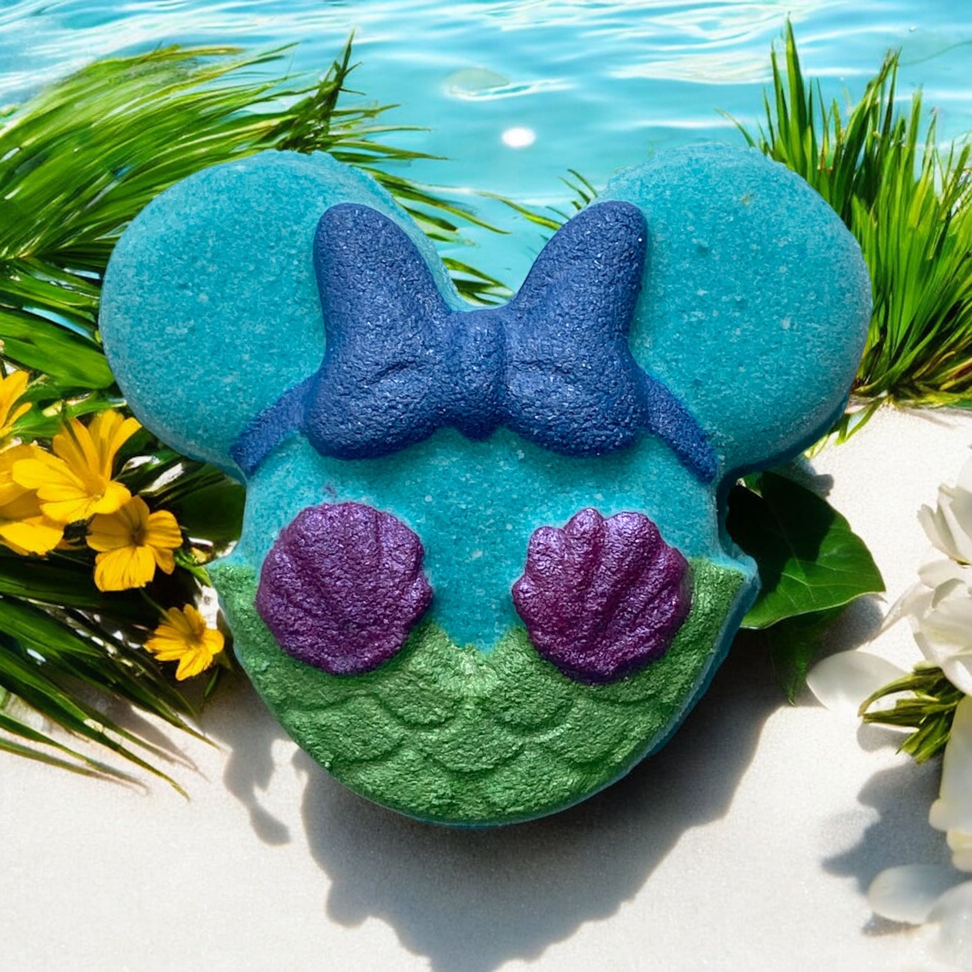 MerMinnie bath bomb. Hand painted shell with hidden color embeds and a shoe charm. A luxurious blend of black amber plum, jasmine blooms, and decadent vanilla woods. 4.2 oz