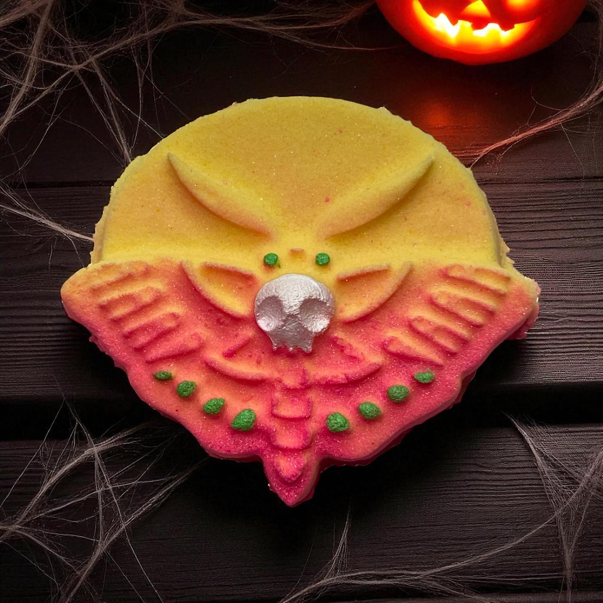 Death moth bath bomb. Hand painted bomb with moth charm and hidden color embeds. Fresh Cut Apples, Cardamom, Warm Caramel, and Cedarwood. 4.3 Oz