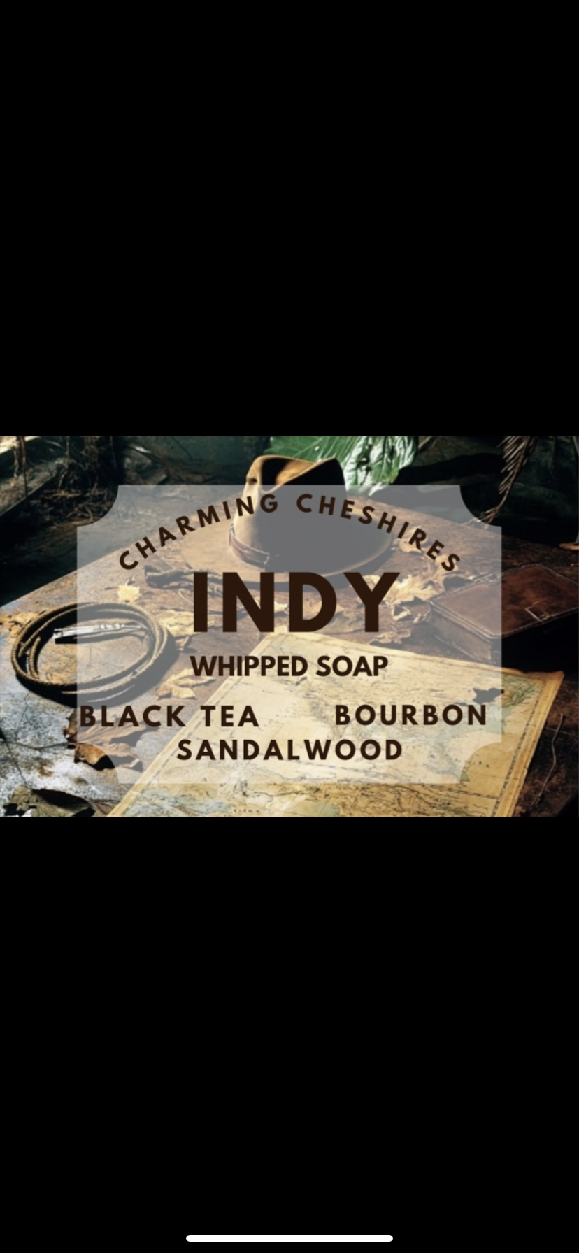 Indy whipped soap. This fragrance opens like a dusty library in a forgotten temple — the smoky depth of black tea swirling with the spiced warmth of crushed cardamom pods, evoking maps spread across oak tables and secrets waiting to be unearthed.