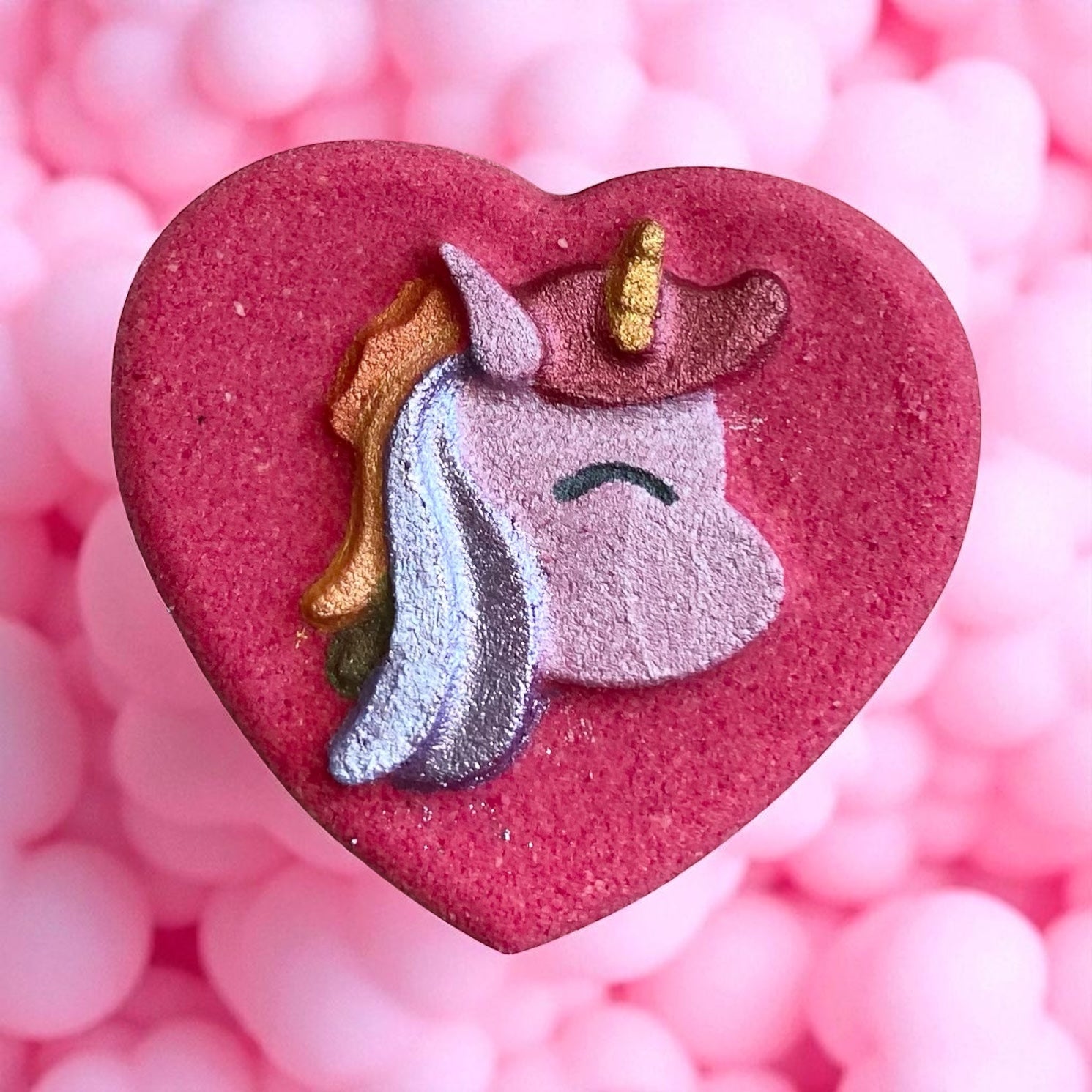 I heart unicorns bath bomb. Hand painted bath bomb with color embeds and a unicorn shoe charm. Sweet apple and pear with honey butter, vanilla sugar, and soft musk. 4.4 oz