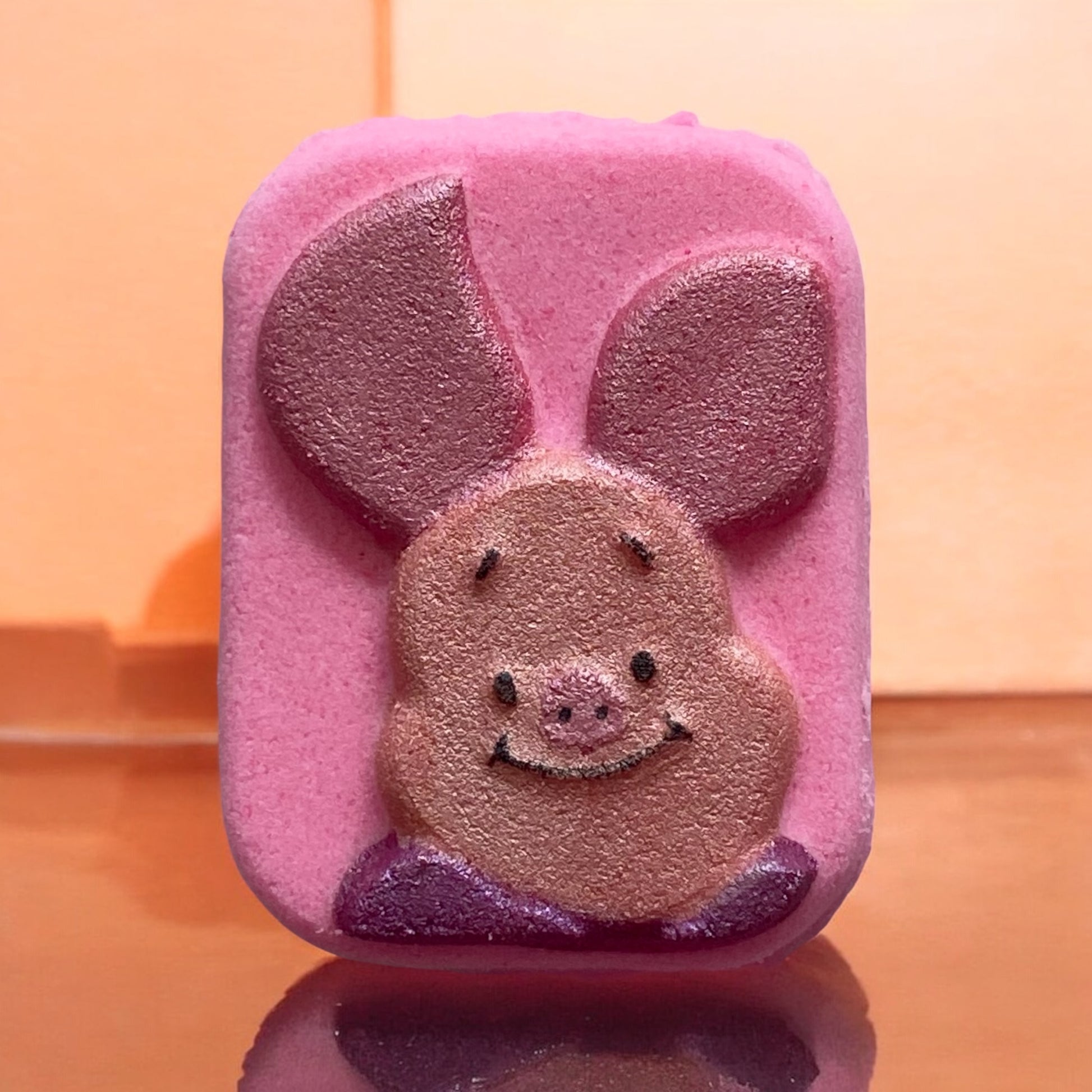 Piglet bath bomb. Hand painted shell with hidden color embeds and a sticker prize. Green blackberry leaves, rose petals and freshly picked berries. 2.6 oz