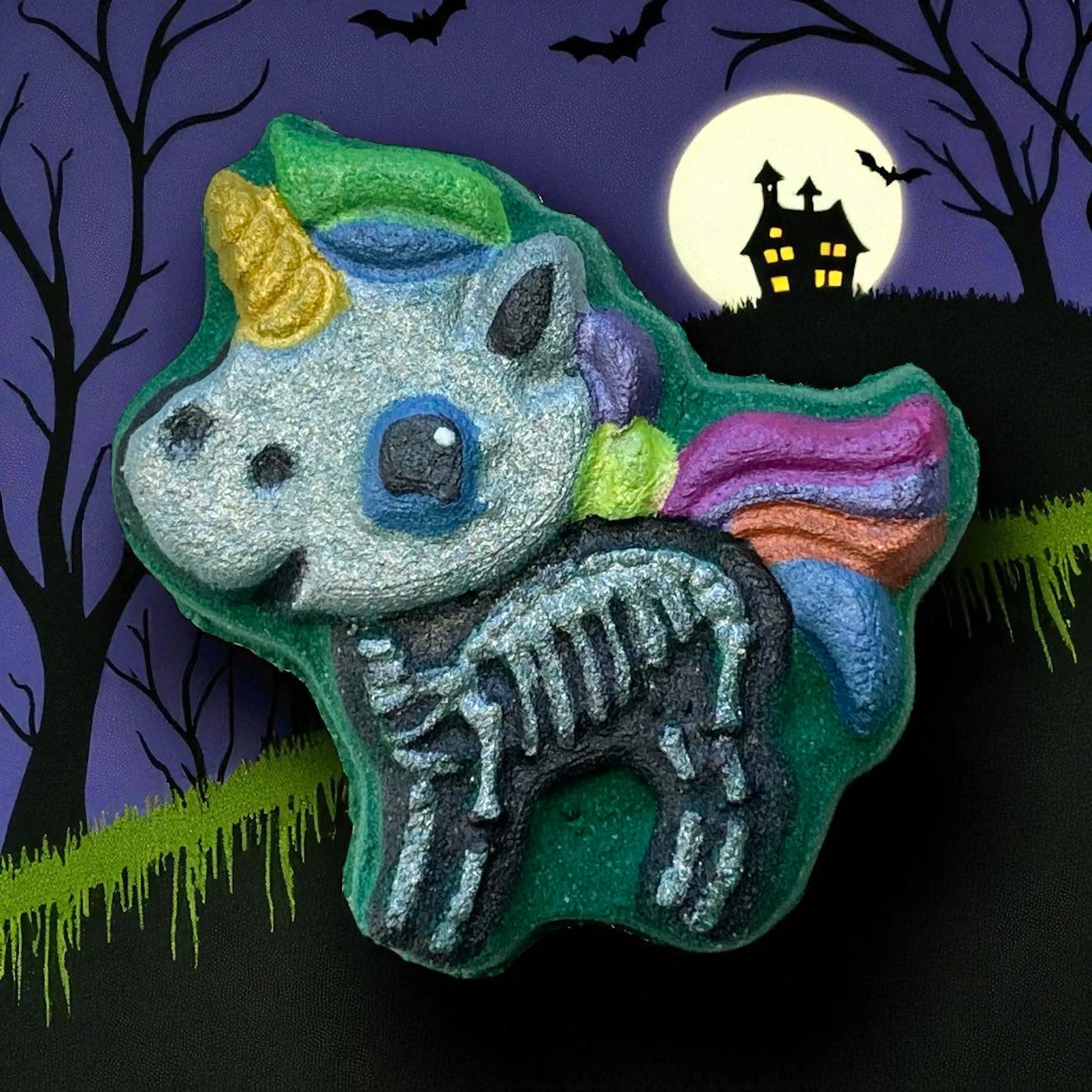 Skeleton unicorn bath bomb. Hand painted shell with hidden color embeds and a shoe charm. Bergamot, blackberry, raspberry, peony, honeysuckle, and violet leaf. Notes of white woods, golden amber, and musk.