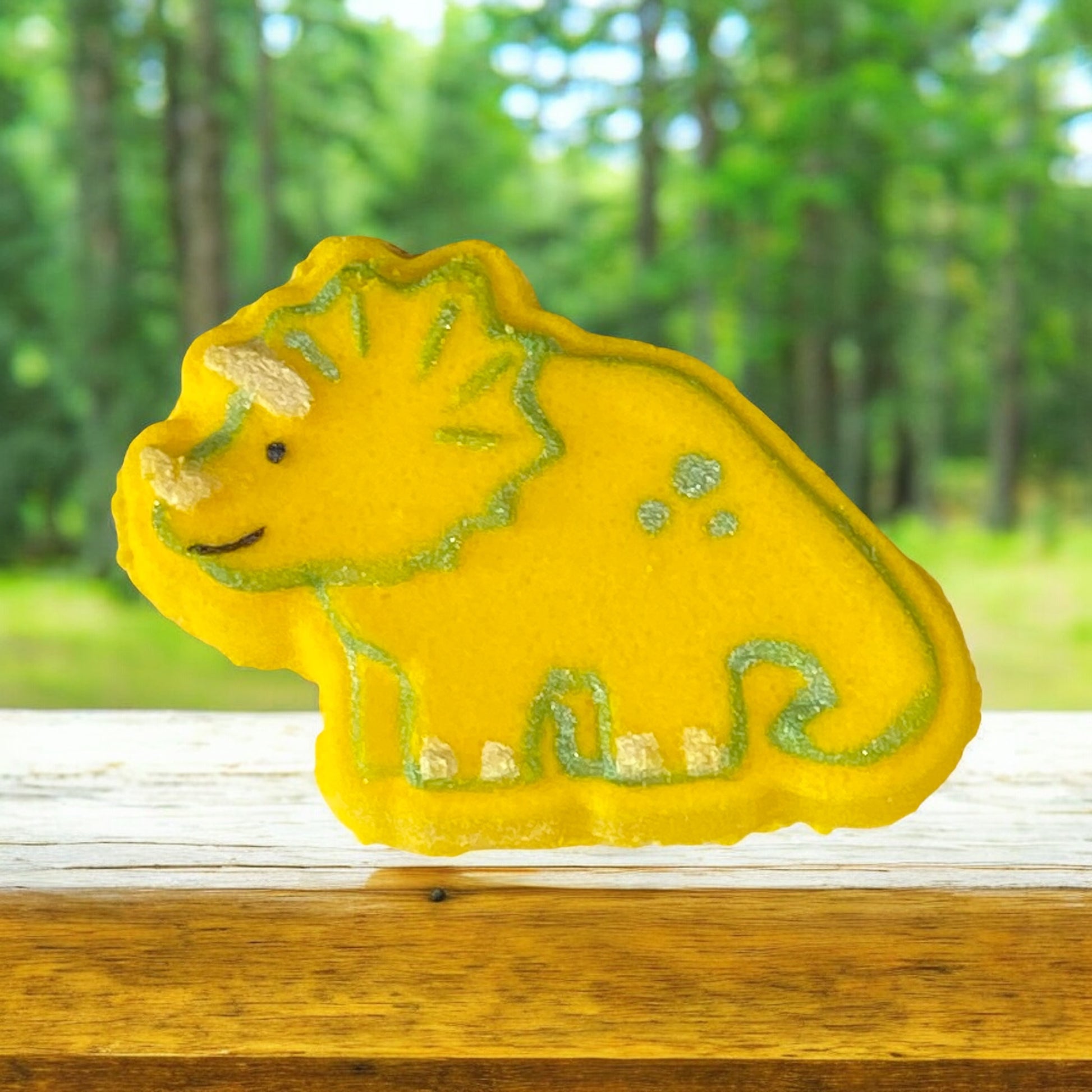 Triceratops bath bomb. A dinosaur sticker is included with this bath bomb with color embeds. Assorted scents and colors 2 oz