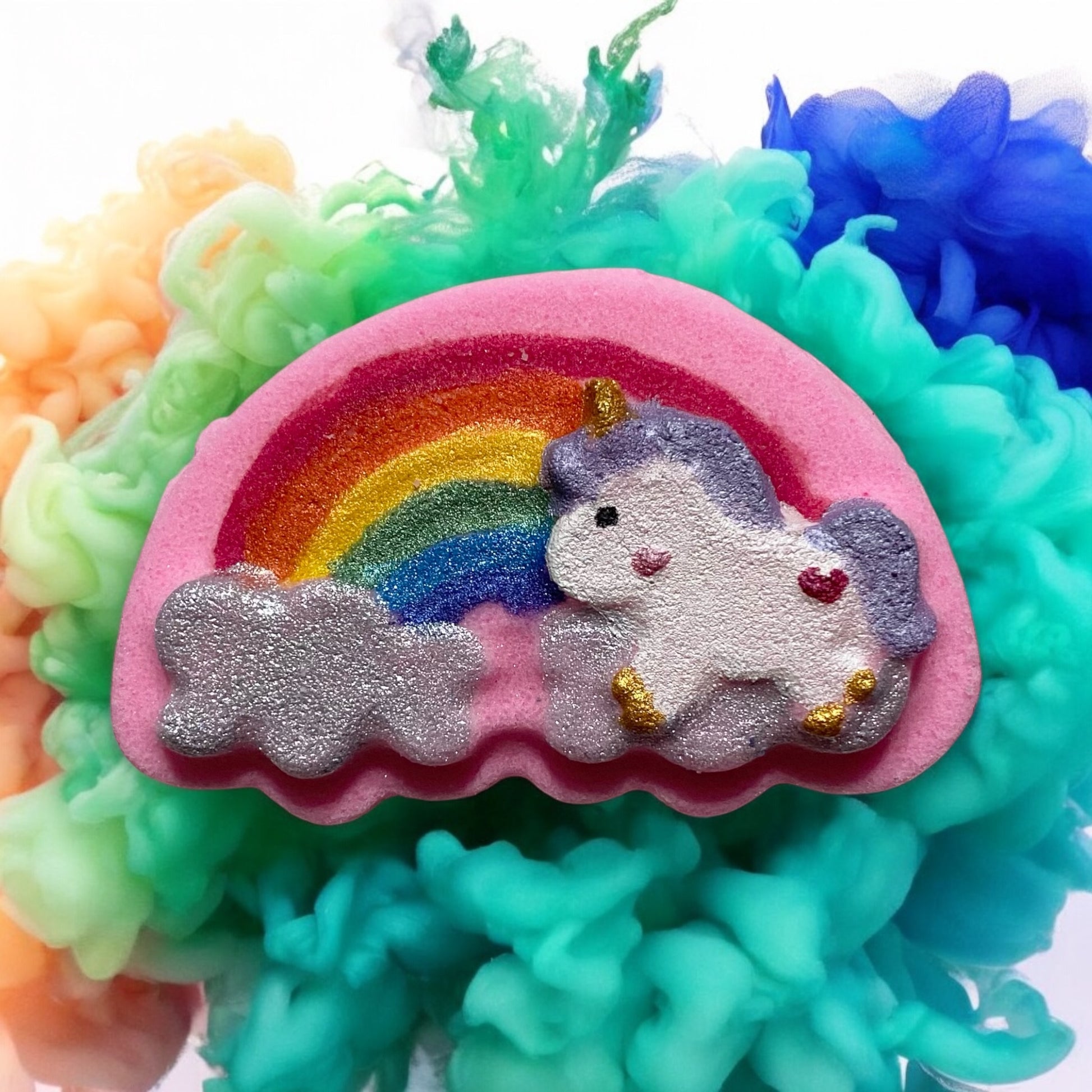 Unicorn Rainbow bath bomb. Hand painted shell with hidden color embeds and a unicorn shoe charm. Scented in a sweet but grounding blend of sweet berries, rhubarb, dark plum, fir needle and oakmoss. 4 oz